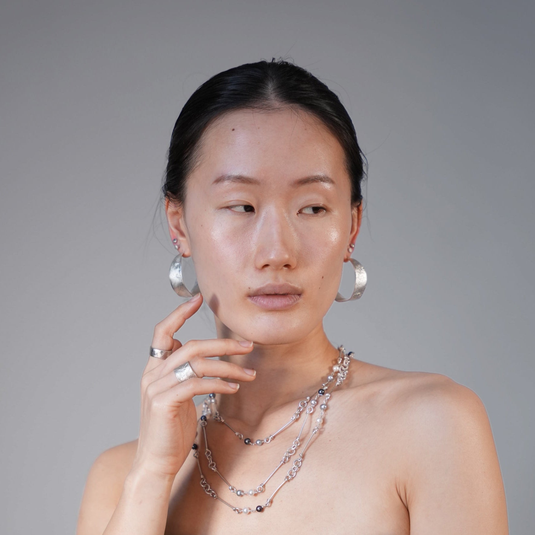 This chain is a blend between T and Tiff's Chains. Blue-grey, A-grade freshwater pearls sit gently between the links, softening the stiff silver.