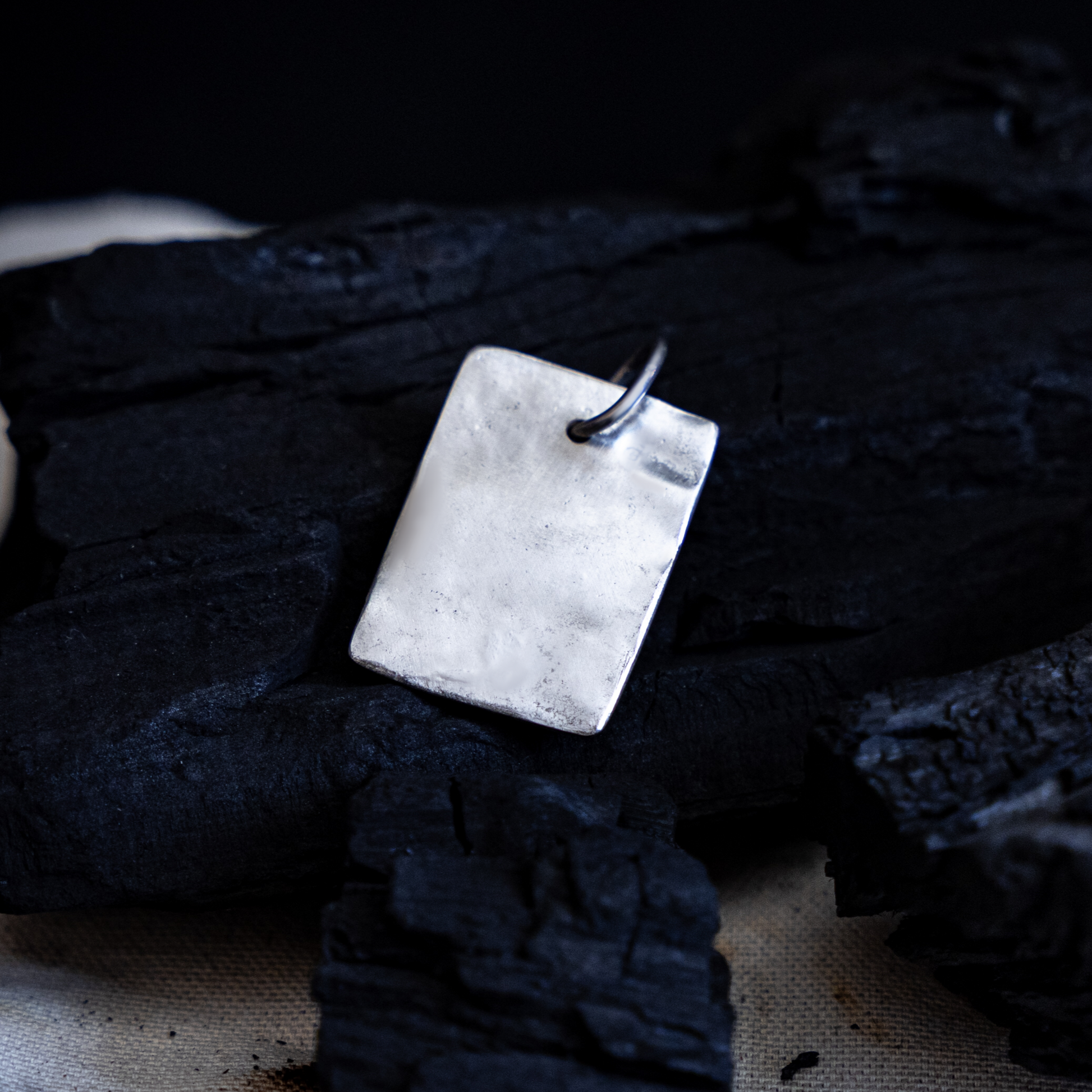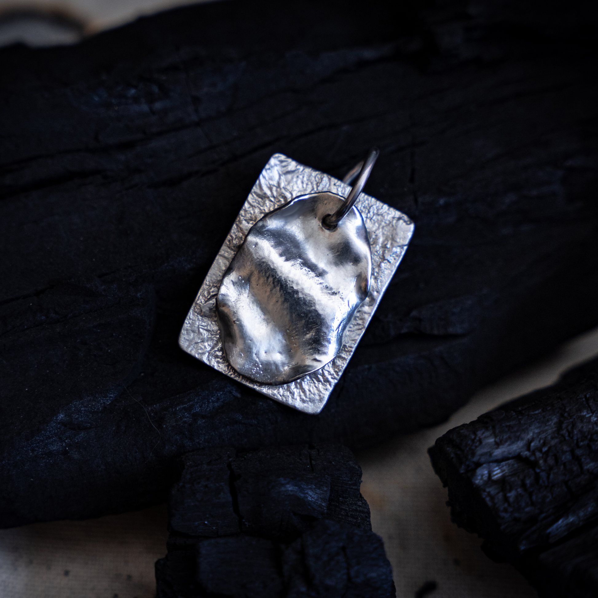 This pendant features two freely hanging forms that can be worn in four orientations [see photos]. Both are smooth on one side and textured on the other.